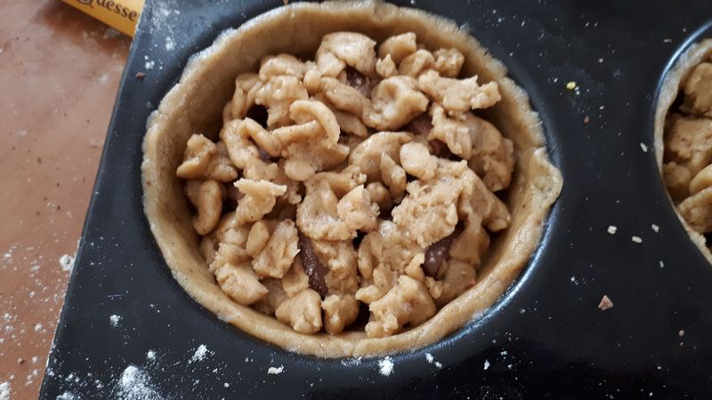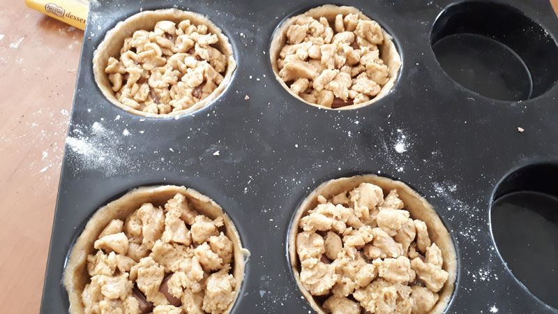 - Sortir la pâte puis foncer vos moules directement avec les mains sans la rouler, puis garnir de chocolat, disposer plusieurs carrés de chocolat, n’hésitez pas à mettre plusieurs couches pour que cela soit gourmand.