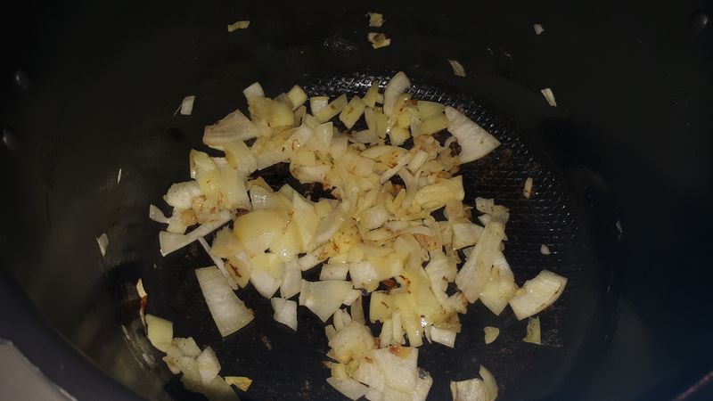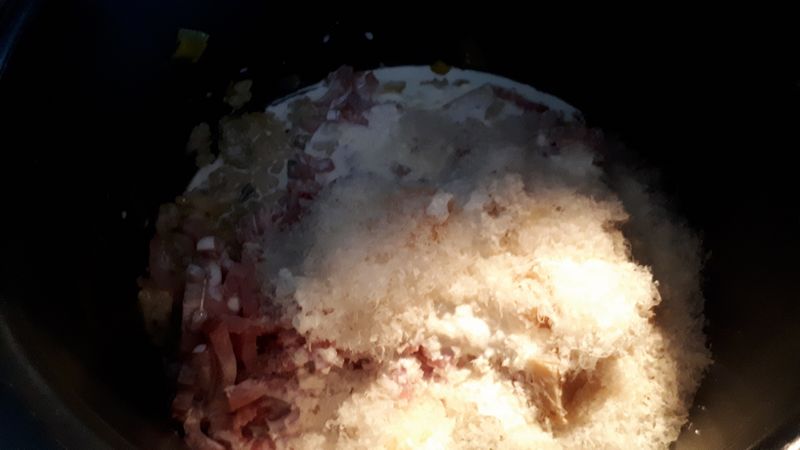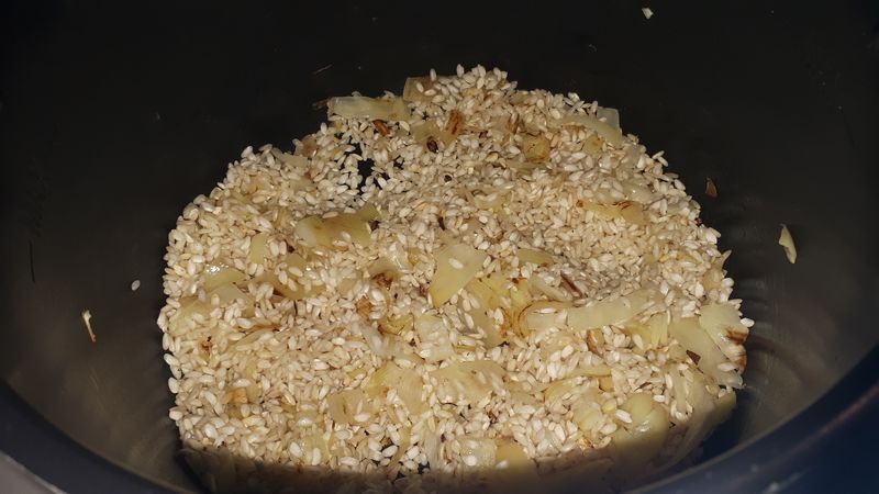 - En mode dorer, faire suer l’oignon émincé dans l’huile d’olive pendant 1 minute puis nacrer le riz pendant 3 minutes en remuant.