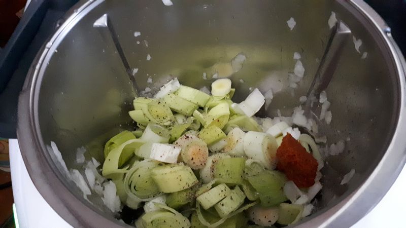 4. Éplucher et couper votre oignon en 4, le déposer dans le bol du Thermomix et mixer 5sec/vit5, verser un filet d’huile d’olive, ajouter les poireaux, la pâte de curry, la moitié d’un gobelet d’eau et un peu de sel puis faire chauffer 10 min/110°C/ Vit 1 sans le gobelet. Verser cette préparation sur le surimi.