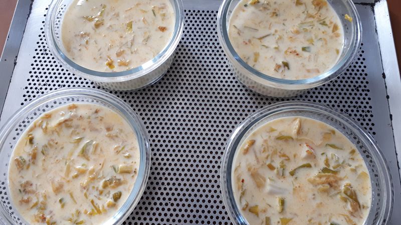 6. Préparer l’appareil à clafoutis en mélangeant les œufs, la crème, le mélange lait-fécule, du sel, du poivre.