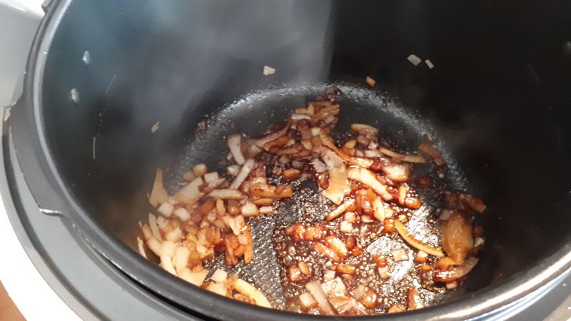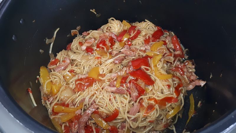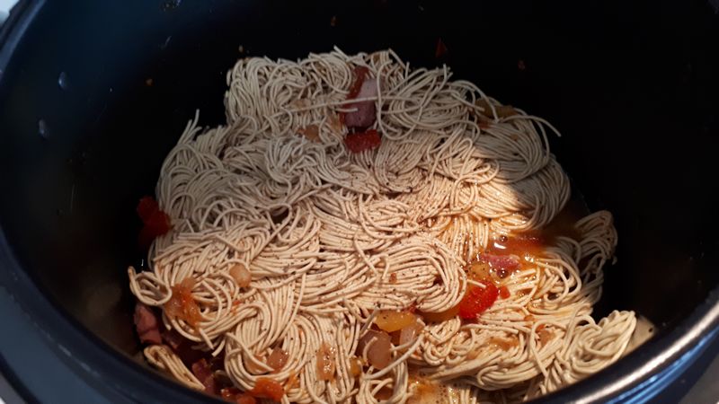 - Ajouter les nouilles, les casser un peu, mélanger, ajouter sur le dessus le bouillon chaud, mélanger assaisonner puis lancer le mode sous pression 3 minutes.