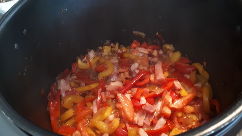 - Mettre le Cookéo en mode dorer, lorsque le préchauffage est à la moitié y déposer l’oignon et l’huile, et laisser dorer 1 minute, ajouter la sauce, mélanger et laisser dorer 1 minute ajouter les lardons, les poivrons, les tomates, mélanger puis laisser dorer à nouveau pendant 5 minutes toujours en mélangeant.