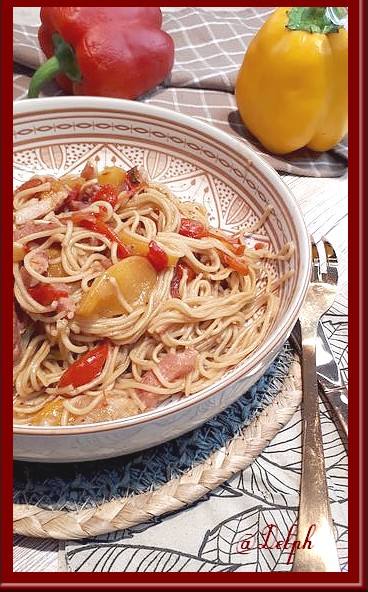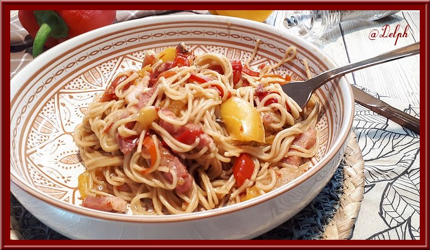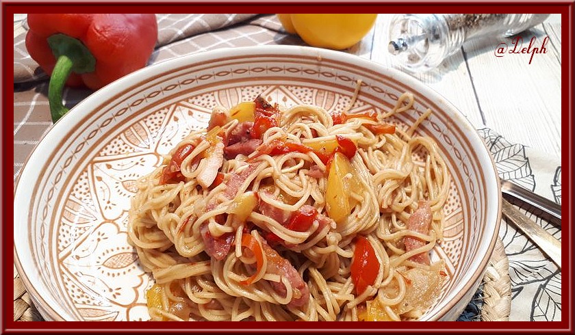 C’est mon mari qui m’a réclamé cette recette, il a trouvé de beaux poivrons et a eu envie que je lui fasse des nouilles chinoises avec. Alors me voilà partie en cuisine.