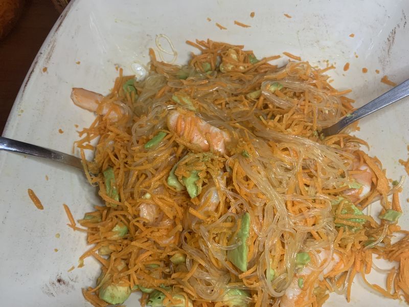 J’avais acheté des vermicelles de riz pensant faire des rouleaux de printemps, et puis j’ai eu envie de faire une bonne salade fraîche à la place. Cela change et c’est très agréable.