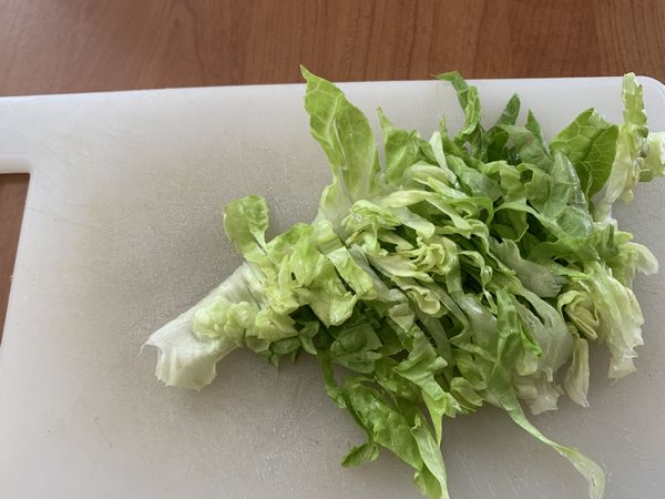 - Couper votre salade en lanières, la disposer au fond des assiettes, puis disposer le précédent mélange.