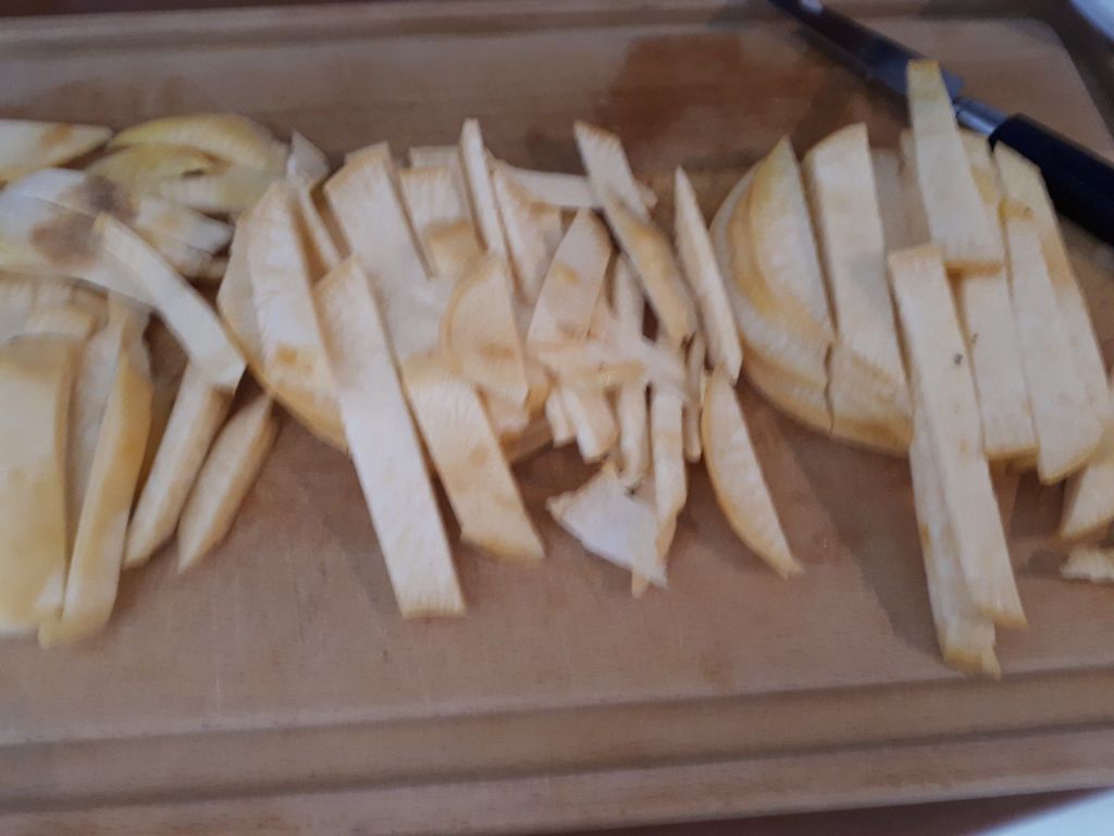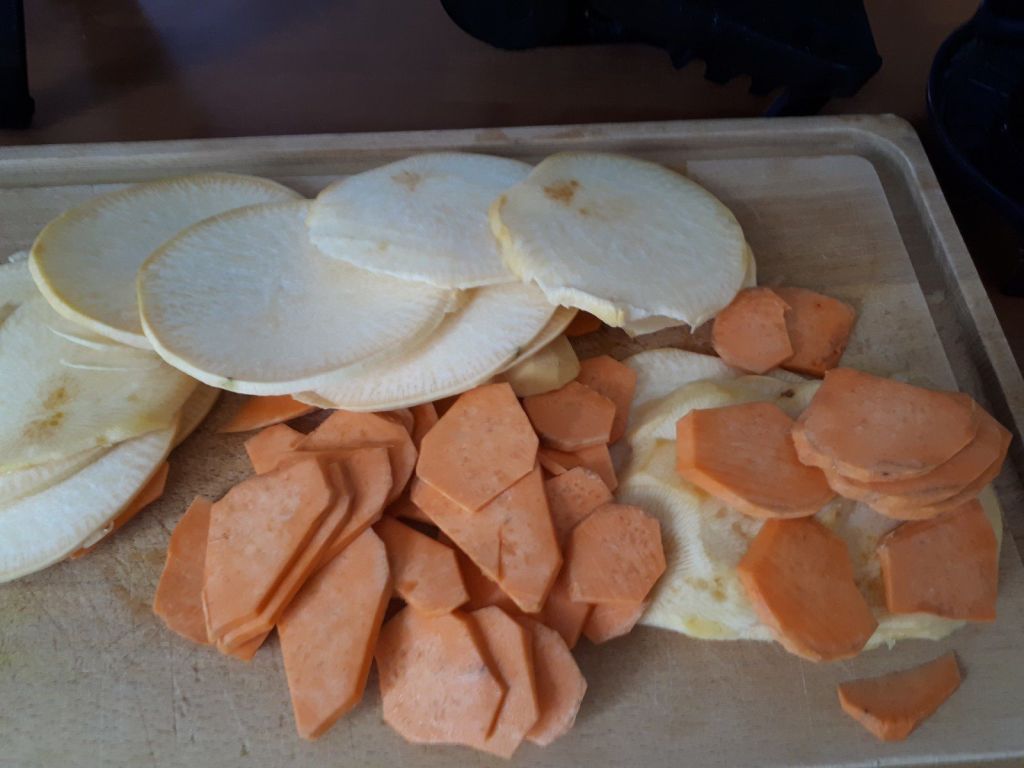 - Éplucher et laver votre patate douce et votre navet, les couper en fines tranches grâce à une mandoline. Mon navet était assez gros, je l’ai donc retaillé en bâtonnets.