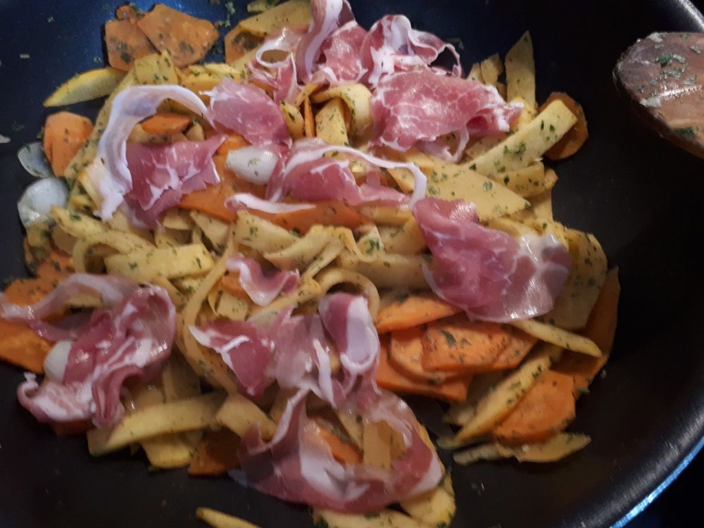 - En fin de cuisson mettre les tranches de Pancetta, puis laisser revenir encore 5 minutes.