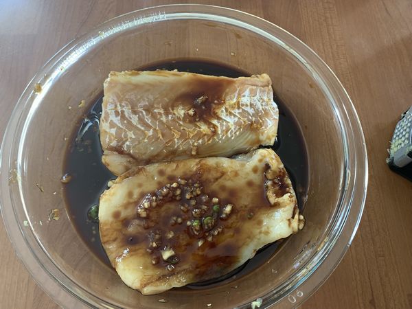 - Éplucher et hacher votre gousse d’ail, faire de même avec votre gingembre. Mélanger le tout aux deux sauces soja. Verser cette préparation sur votre poisson et laisser mariner 30 minutes.