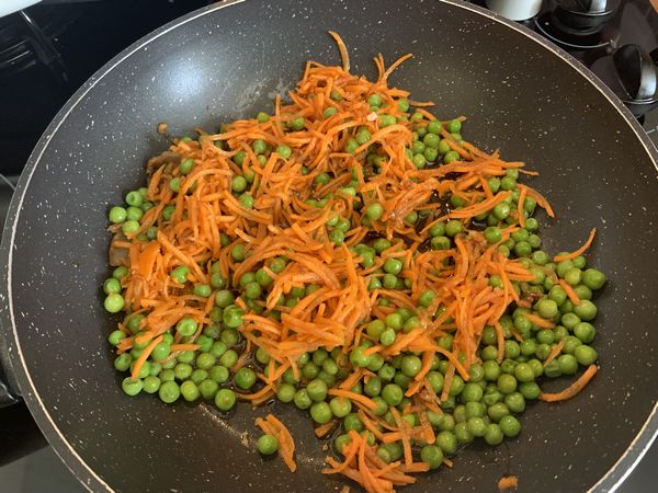 - Enlever le poisson, puis mettre à la place les carottes et les petits pois, mélanger, verser le reste de marinade, mélanger faire chauffer sur feu moyen environ 5 minutes, ajouter les vermicelles, mélanger le tout continuer la cuisson environ 5 minutes. Remettre sur le dessus le cabillaud environ 3 minutes.