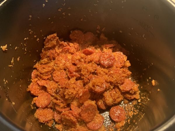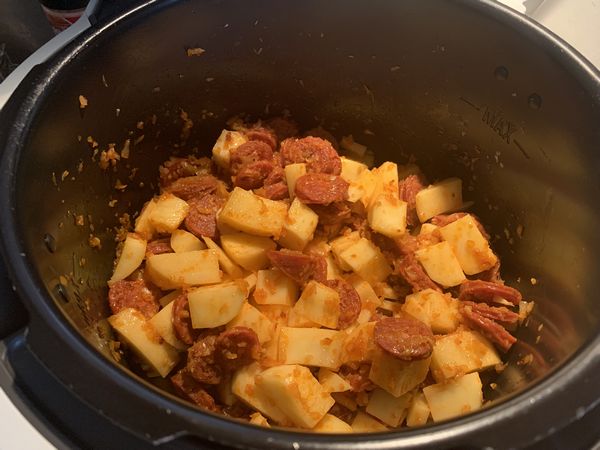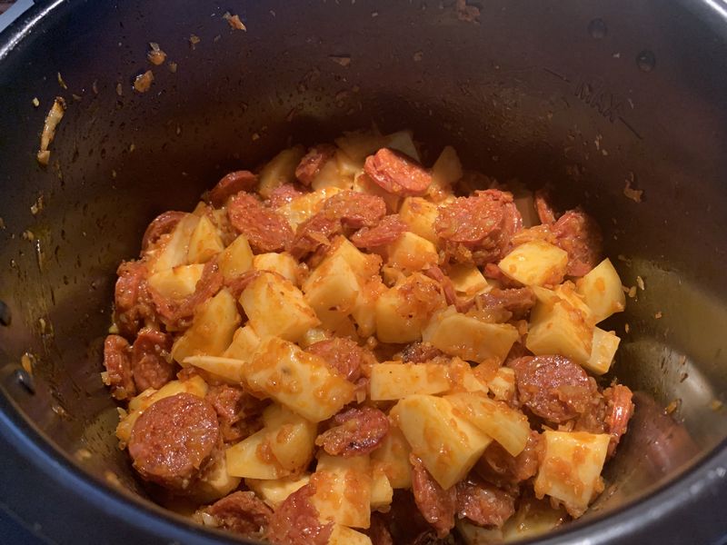 2. Mettre dans la cuve du Cookéo l’huile, les oignons et l’ail hachés puis faire dorer 2 minutes, mélanger, incorporer le chorizo, mélanger et laisser dorer 2 minutes, verser les pommes de terre et laisser dorer 4 minutes, toujours en mélangeant.