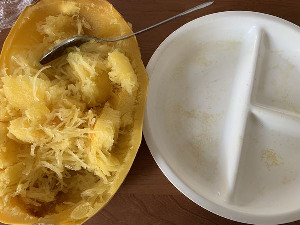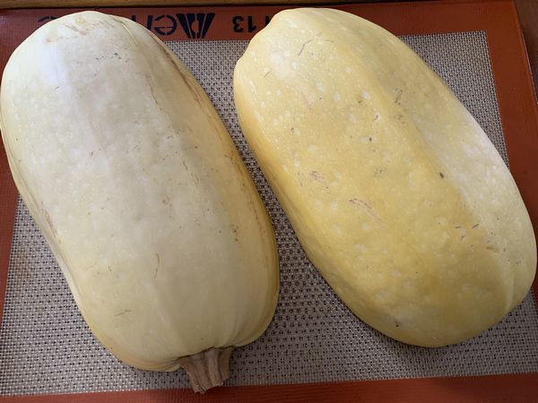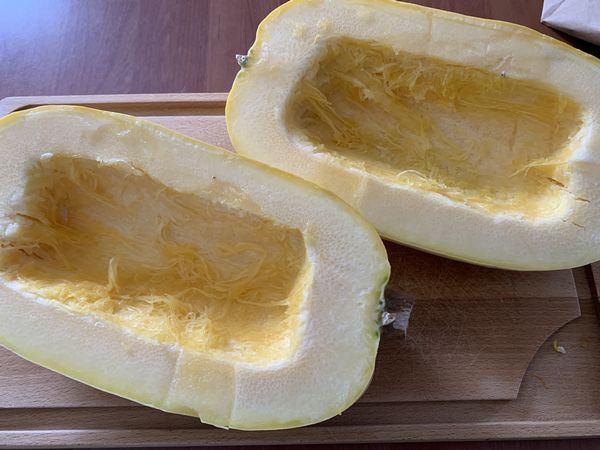 2. Couper la courge spaghetti en deux dans le sens de la longueur. L’épépiner puis placer un ou deux morceaux sur une plaque allant au four, chair vers le bas. (J’ai fait cuire les deux parties d’un coup, mais je n’en ai utilisé qu’une, l’autre partie a été utilisé pour la quiche.)