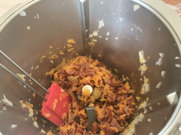 4. Éplucher et couper l’oignon en deux, le mettre dans le bol puis mixer 5sec/vit5, ajouter le chorizo coupé en petits morceaux avec de l’huile d’olive, assaisonner à votre convenance et faire chauffer 5min/100°C/couteau inversé/vit2. Réserver, inutile de rincer le bol.