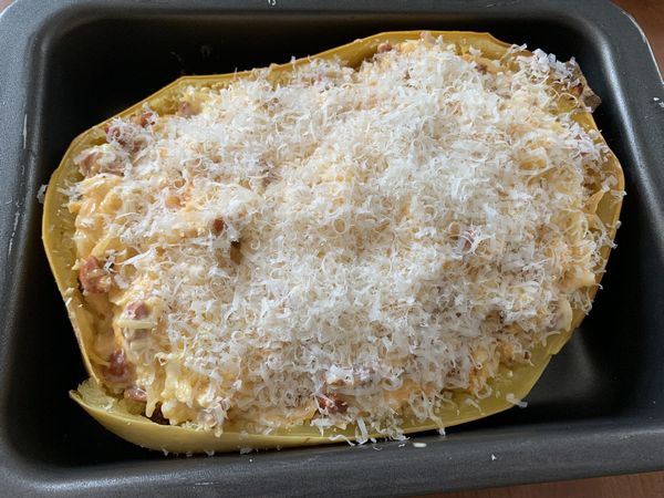 7. Mélanger la courge, la crème, les oignons et le chorizo puis remettre dans la coque de la courge, parsemer de parmesan râpé puis enfourner pour 20 minutes, augmenter la température du four à 205° pour 5 minutes pour dorer le fromage.
