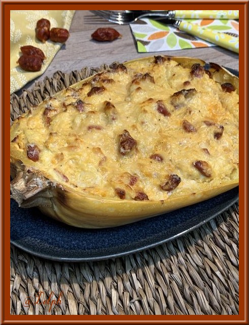 Après avoir réalisé la quiche sans pâte à la courge spaghetti, il me restait une moitié de courge, j’ai donc fait ce gratin. J’ai mis du chorizo pour relever le plat car cette courge est un feu fade je trouve.