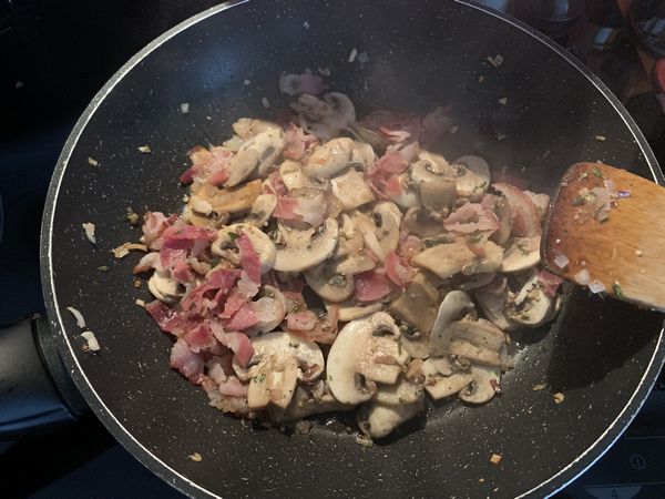 - Ajouter la pancetta coupée en lanières, laisser chauffer 2 à 3 minutes puis ajouter les champignons lavées et coupées en fines tranches, poivrer. Laisser chauffer sur feu un peu plus fort, les champignons doivent être légèrement dorés mélanger pour que cela n’accroche pas.