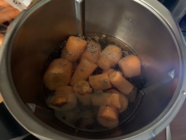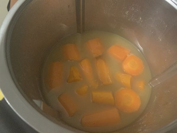 - Mettre vos châtaignes, vos carottes pelées, lavées et coupées en rondelle dans le bol, couvrir avec le bouillon, assaisonner avec du sel, poivre et le cumin puis faire chauffer 20 min/varoma/vit mijotage.