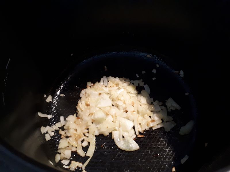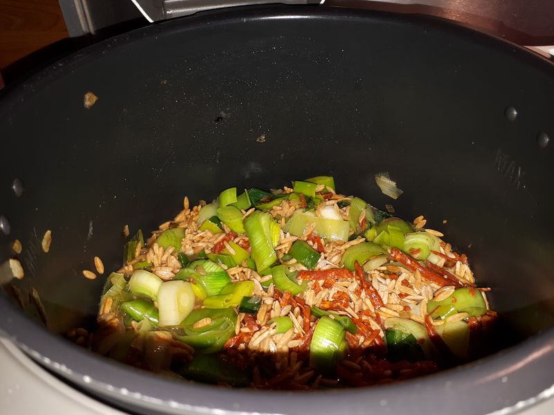 - Ajouter le chorizo, le bouillon, les pâtes, du sel, du poivre et le piment puis passer en mode sous pression pour 8 minutes.