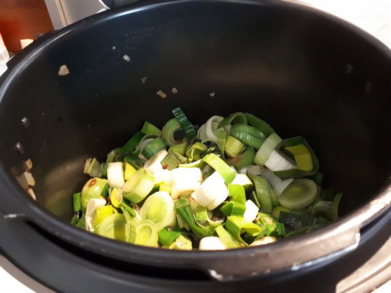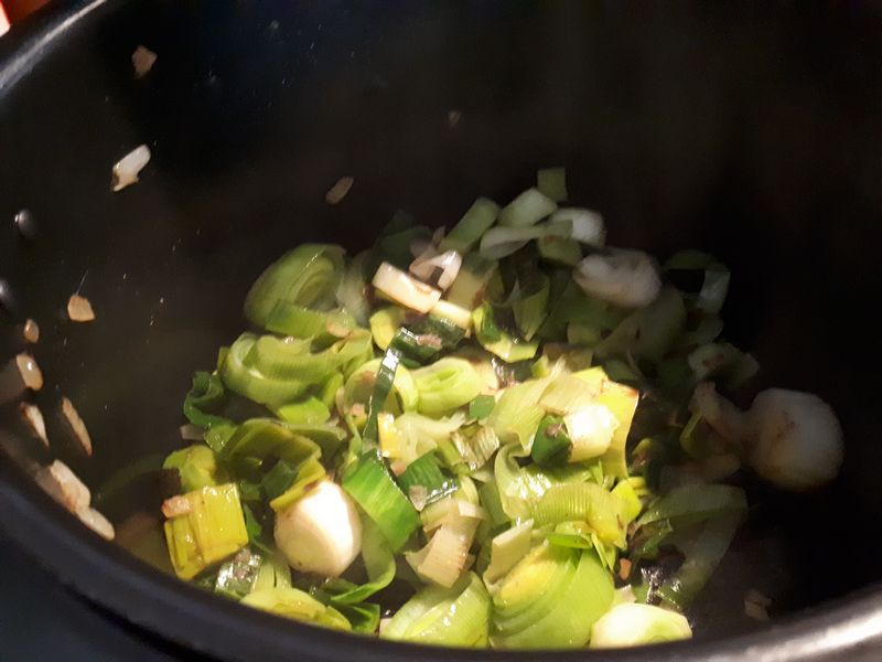 - Mettre votre Cookéo en mode dorer y déposer l’huile et l’oignon et faire dorer 1 minute en mélangeant, ajouter les poireaux mélanger et faire dorer 4 minutes.