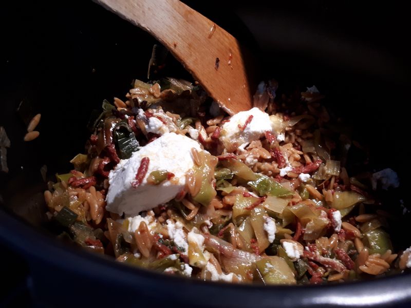 Un nouveau one pot, qui nous a régalé. Il est délicatement épicé avec le chorizo et le piment d’Espelette et bien crémeux avec l’ajout de la ricotta en fin de cuisson. J’ai utilisé mes petites pâtes en forme de riz que j’avais achetées lors d’une de mes sorties au Printemps du goût à Paris.