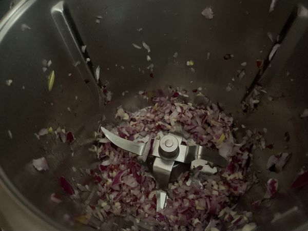 - Peler l’oignon et le couper en deux, peler la gousse d’ail, la couper en deux et la dégermer, mettre le tout dans le bol du Thermomix puis mixer 5sec/vit5.