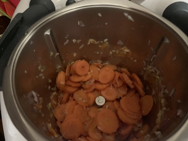 - Peler, laver et couper vos carottes en fines rondelles, les ajouter dans le bol avec le beurre coupé en morceaux puis faire chauffer 6 min/120°C/couteau inversé/vit mijotage.