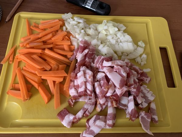1. Préparer vos ingrédients, éplucher et ciseler vos oignons, éplucher, laver et couper vos carottes en bâtonnets, enlever la couenne de la poitrine fumée et la tailler en lardons.