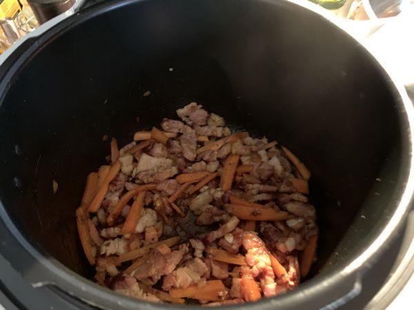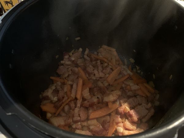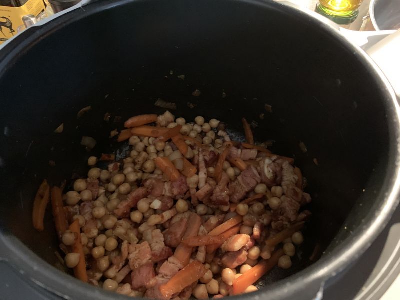 2. Mettre votre Cookéo en mode dorer, y déposer la pâte de curry, puis verser les oignons, les lardons et la carotte, mélanger très régulièrement et laisser dorer 5 minutes, déglacer au vin blanc, et mélanger 1 minute.