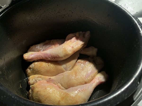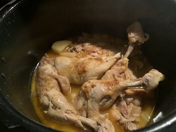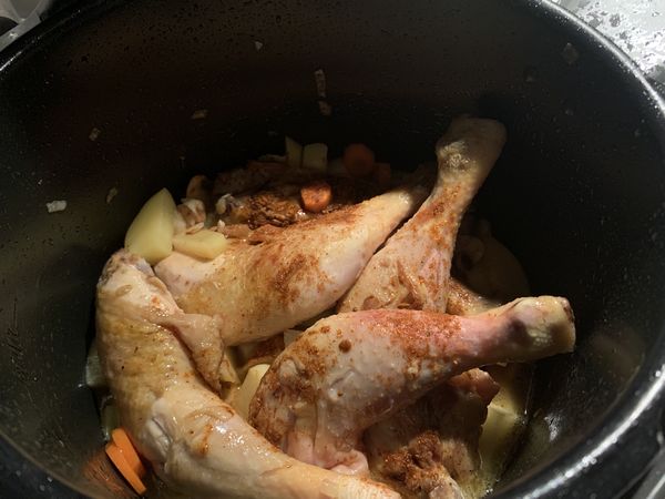 - Mettre la graisse de canard dans la cuve du Cookéo et lancer le mode dorer, faire dorer les cuisses de poulet pendant 10 minutes en les retournant régulièrement. Enlever les cuisses et les réserver.