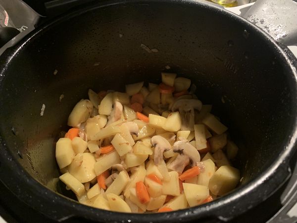 - Préparer vos légumes, éplucher et ciseler votre oignon, éplucher laver et couper vos carottes en rondelles, éplucher, laver et couper vos pommes de terre en gros cubes. Nettoyer vos champignons et les couper en tranches.