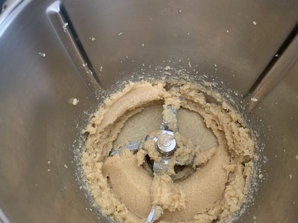 - Mettre dans le bol, le beurre mou coupé en morceaux, la cassonade, et le sucre puis mélanger 3min/vit 2, racler les bords.