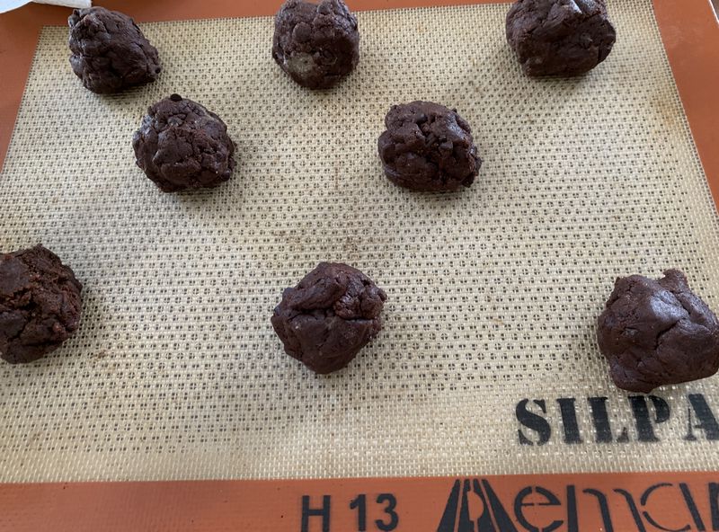 - Sur une plaque de cuisson avec un papier sulfurisé, déposer des boules de pâtes, à l’aide de votre de paume de main les écraser légèrement, les espacer, puis enfourner pour 15 minutes.