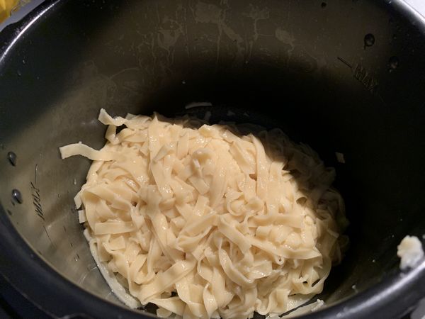 - Verser 50 cl d’eau et un peu de sel dans la cuve du Cookéo et y plonger les tagliatelles fraîches.