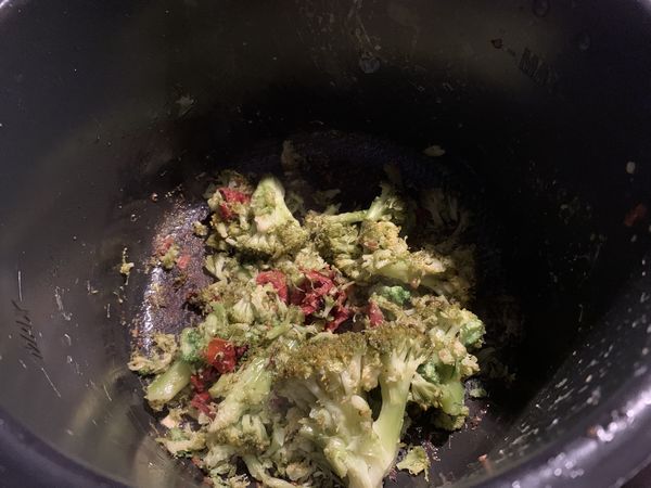 - Passer en mode dorer, mettre l’huile de tomates, puis les tomates séchées coupées en petits bouts, ajouter les têtes de brocolis assaisonner et laisser dorer 2 minutes, mélanger délicatement pour ne pas trop casser le brocolis, ajouter le crème mélanger 1 minute.
