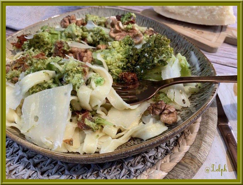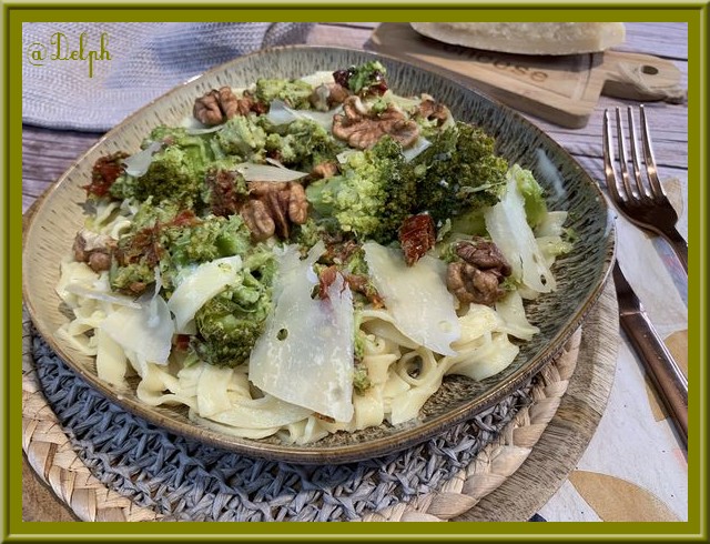 comment vas tu? Voilà une bonne idée de menu 🙂 Le mélange brocoli, tomates séchées et noix à l’air délicieux et accompagne parfaitement les tagliatelles 🙂