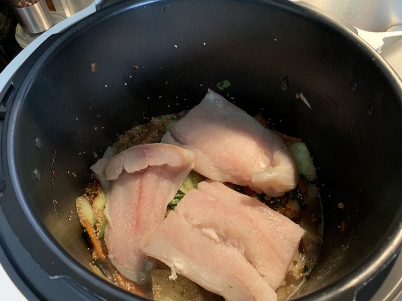 - Verser le quinoa dans la cuve, mélanger, puis verser le bouillon, assaisonner, mélanger et positionner le poisson sur le dessus, puis passer en mode sous pression pour 6 minutes.
