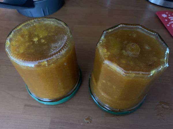 - Retirer l’anis étoilé et mixer 15 sec/vit5 à 10 en augmentant progressivement la vitesse. Verser la marmelade dans les pots dès la fin de la cuisson, les fermer et les retourner pour réaliser le vide d’air. Attendre que les pots tiédissent pour les remettre à l’endroit.