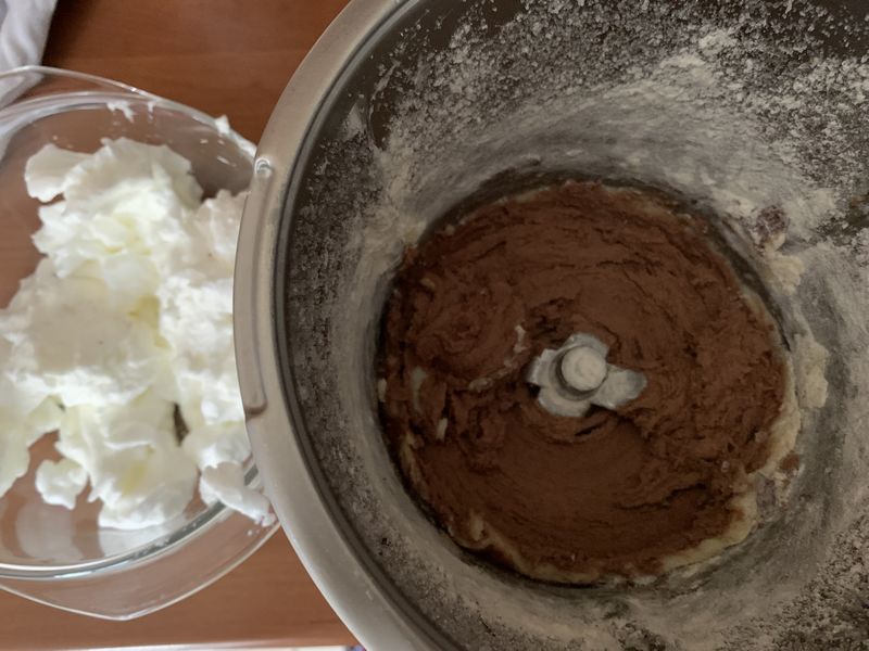 - Ajouter la farine et le chocolat fondu et mélanger 40sec/vit4, racler les bords, finir par incorporer les mélanger 20sec/vit2, puis terminer en donnant quelques coups de spatule.