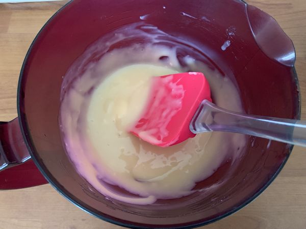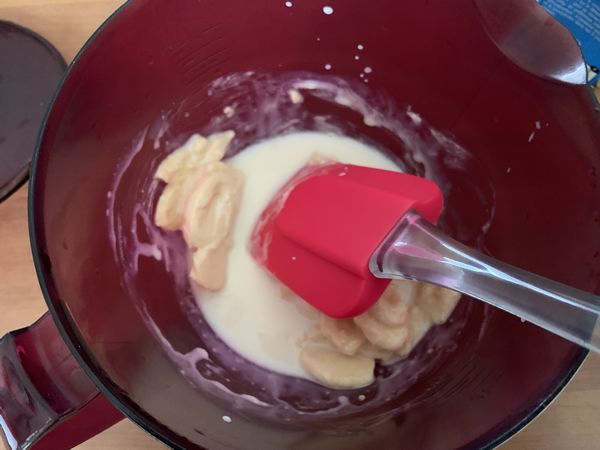 - Faire chauffer votre crème puis ajouter les pistoles de chocolat blanc, bien mélanger jusqu’à ce que le chocolat soit fondu.