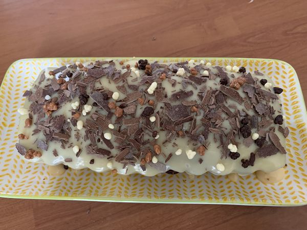 - Répartir le chocolat sur le cake, puis parsemer de copeaux de chocolat et de crumble de meringues.