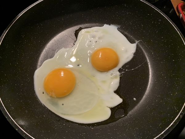 3. Juste avant la fin de la cuisson des pâtes cuire les œufs sur le plat avec un filet d’huile d’olive, saler et poivrer.