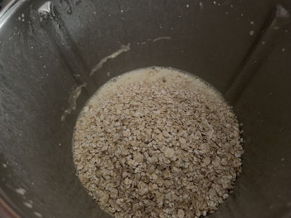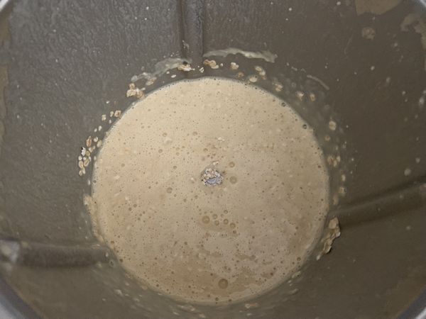 - Mettre dans le bol du Thermomix, la farine, le lait, les œufs la la levure et le sucre vanillé et mélanger 20sec/vit4, puis verser les flocons d’avoine et mélanger 20sec/couteau inversé/vit2.