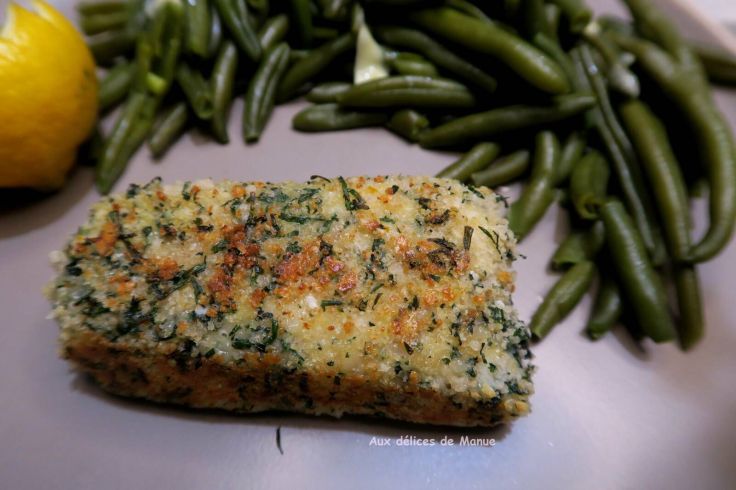 Manue du magnifique blog  "Aux délices de Manue" a testé les cubes de cabillaud poêlés en croûte d'herbes,Manue a utilisé du dos de merlu à  la place du cabillaud.