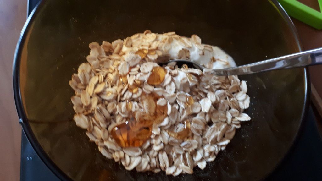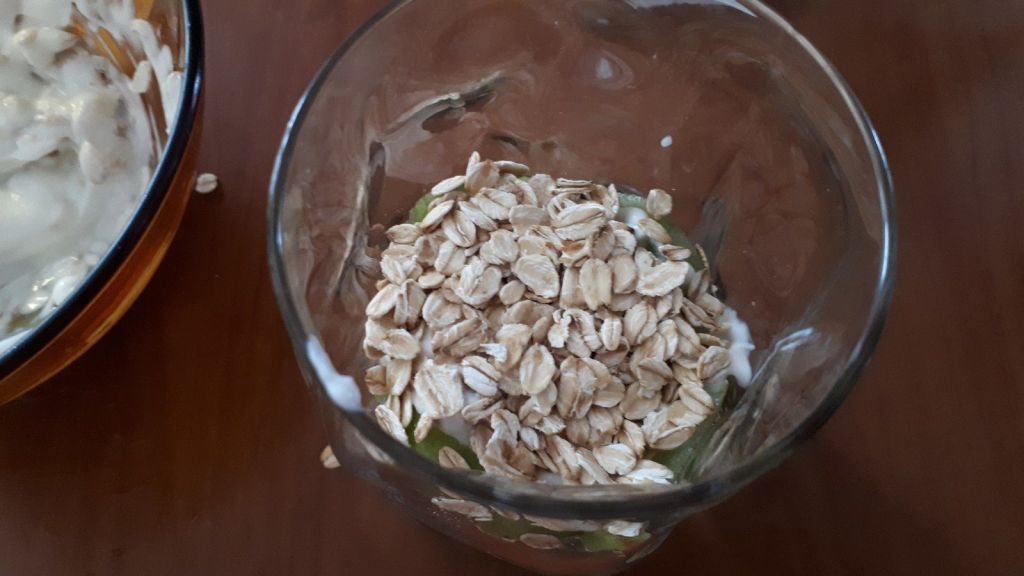 - Mélanger le fromage blanc avec 20 g de flocons d’avoine et le miel, mettre la moitié du fromage blanc au fond des verres, mettre les flocons d’avoine restant par dessus, puis couper la moitié d’un kiwi en petits dés que vous déposerez sur le flocons.
