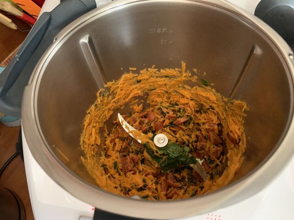- Mettre dans le bol du Thermomix, l’huile d’olive, les carottes, les épinards, et le chorizo et faire chauffer 10min/120°/couteau inversé/vit mijotage.
