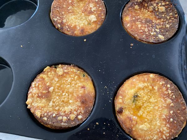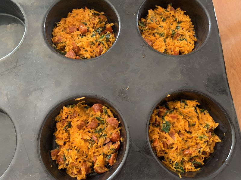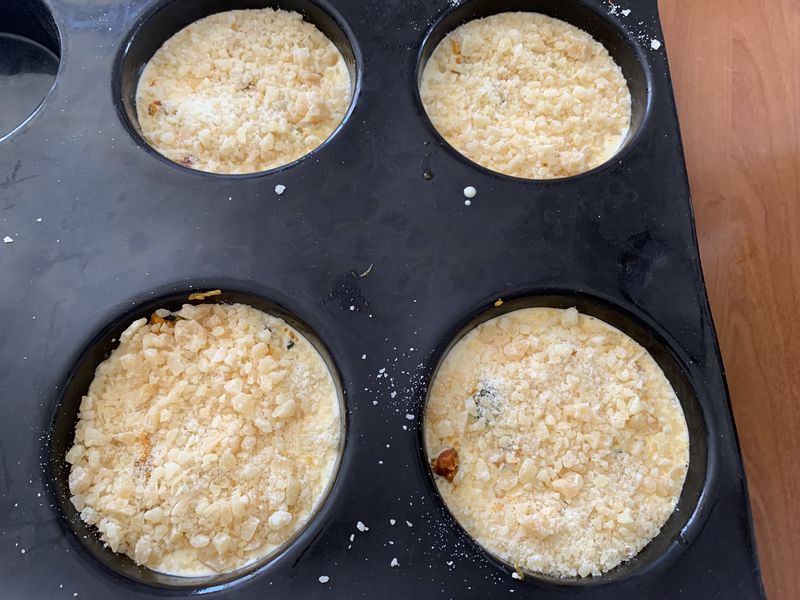 - Déposer au fond de vos moules, les légumes et le chorizo, puis verser l’appareil à clafoutis et finir par parsemer votre parmesan.