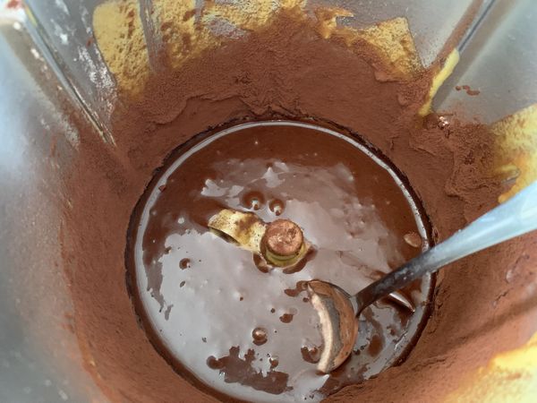 2. Séparer la préparation en deux parts égales. Garder une moitié dans le Thermomix et ajouter le cacao et 1 cuillerée à soupe de lait mélanger 30 sec/vit3.