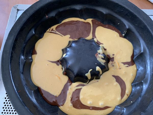 6. Dans un moule beurré et fariné, alterner 2 cuillerées à soupe d’appareil au cacao et deux cuillerées à soupe d’appareil à l’orange, jusqu’à épuisement de vos deux appareils.