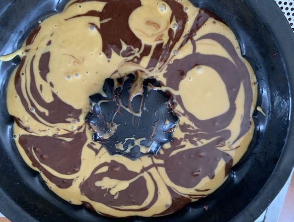 4. Dans un moule beurré et fariné, alterner 2 cuillerées à soupe d’appareil au cacao et deux cuillerées à soupe d’appareil à l’orange, jusqu’à épuisement de vos deux appareils.