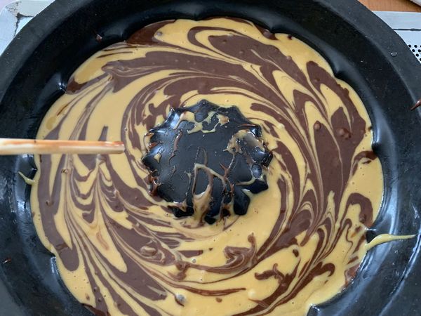 8. Avec un pique en bois, mélanger rapidement la préparation en tournant pour créer les marbrures.
