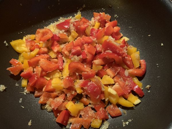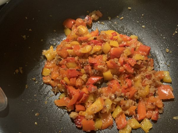 - Laver, couper et enlever les graines des poivrons et les couper en dés.